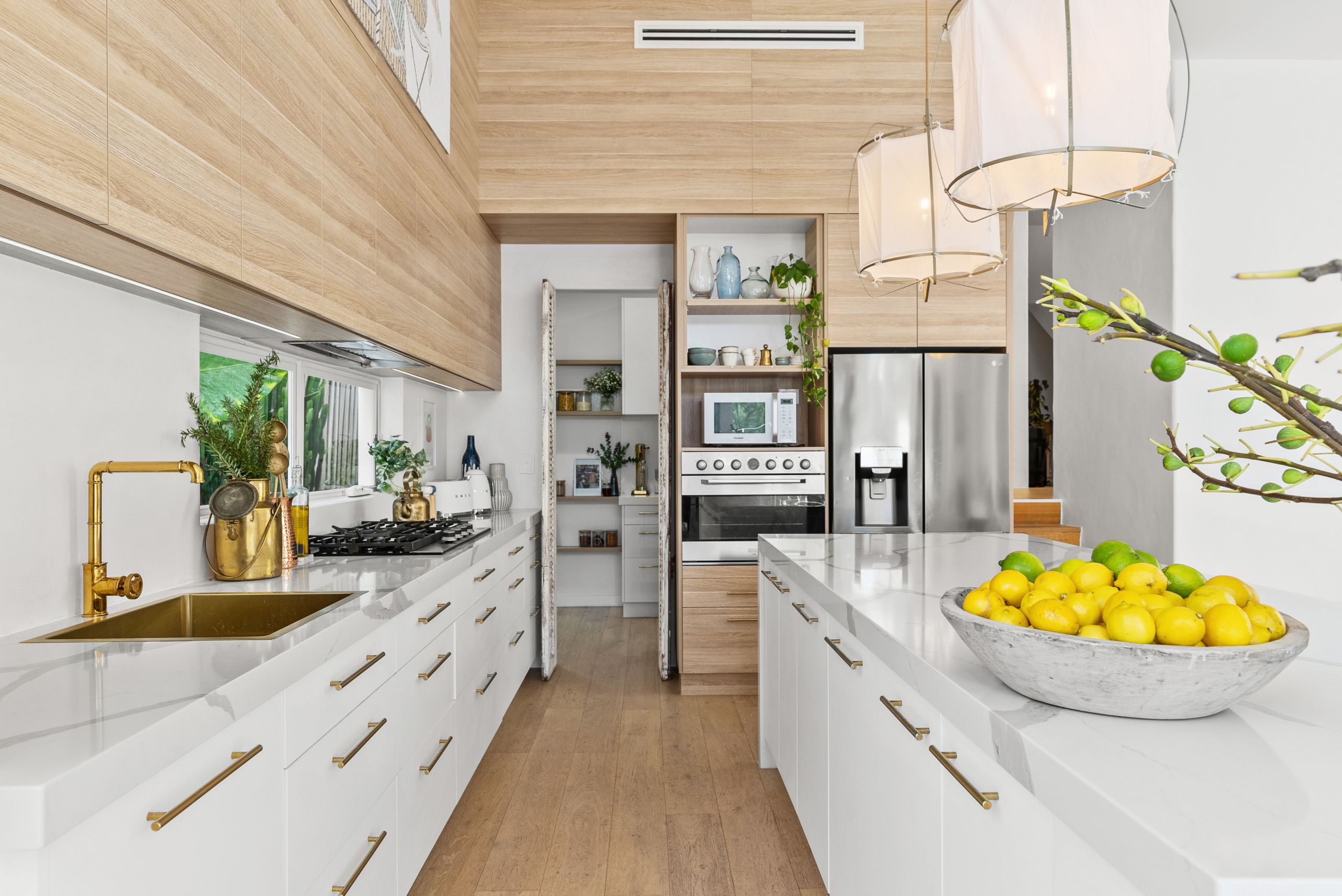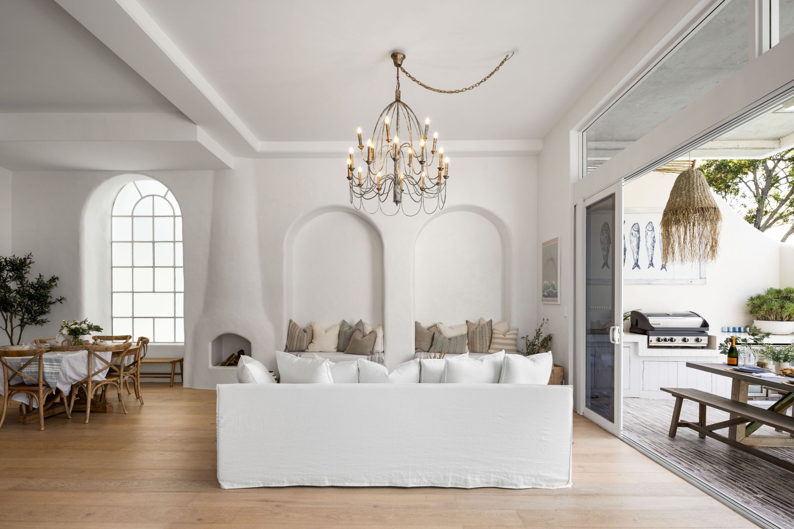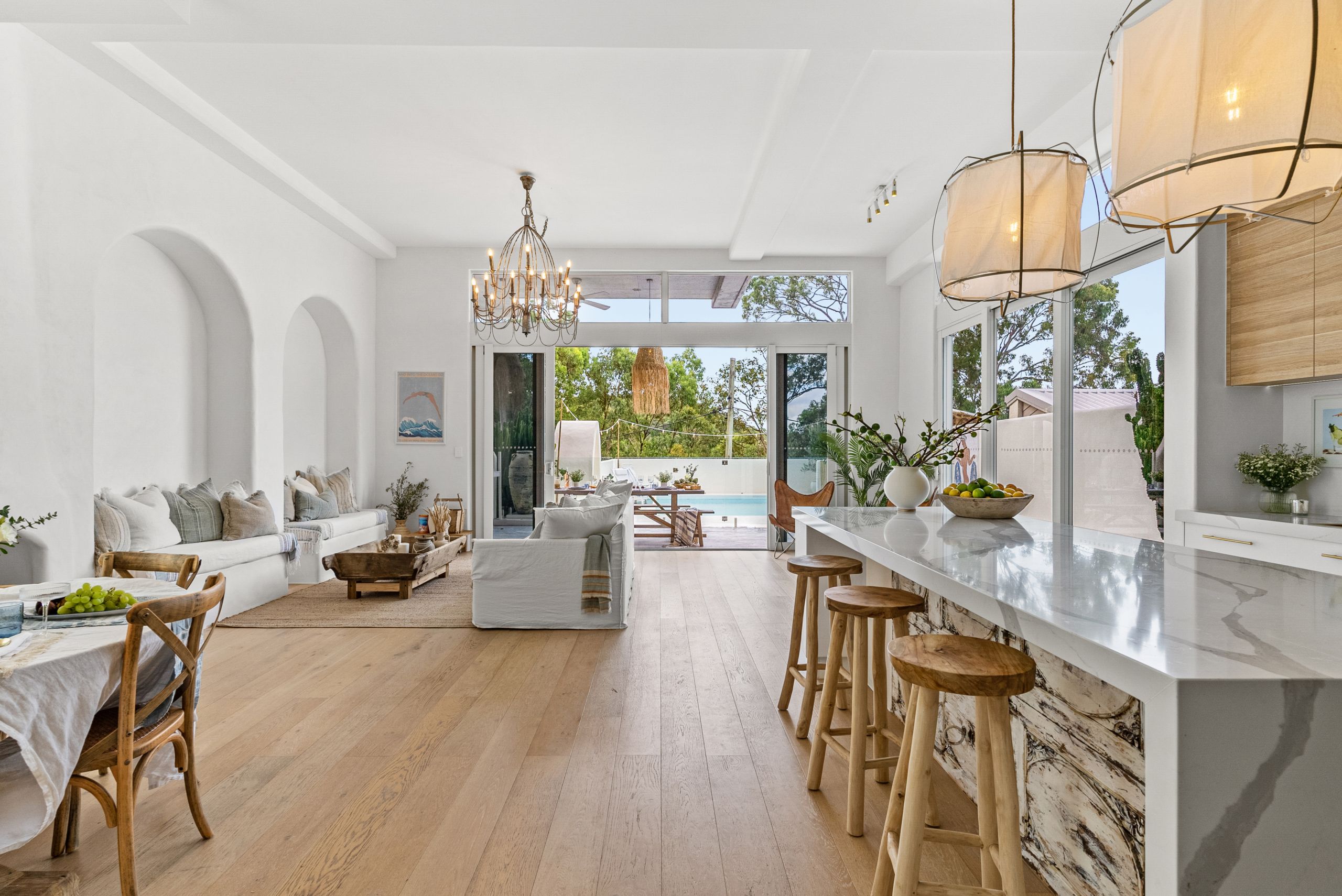 The airy open plan kitchen, dining and living area has been luxuriously designed with Neil Perry’s Omega appliances, stone benchtops, bespoke lighting and a butler’s pantry. Vast glass sliding doors draw in light and ocean air, opening to a wide entertaining deck where sun and breeze define the day.