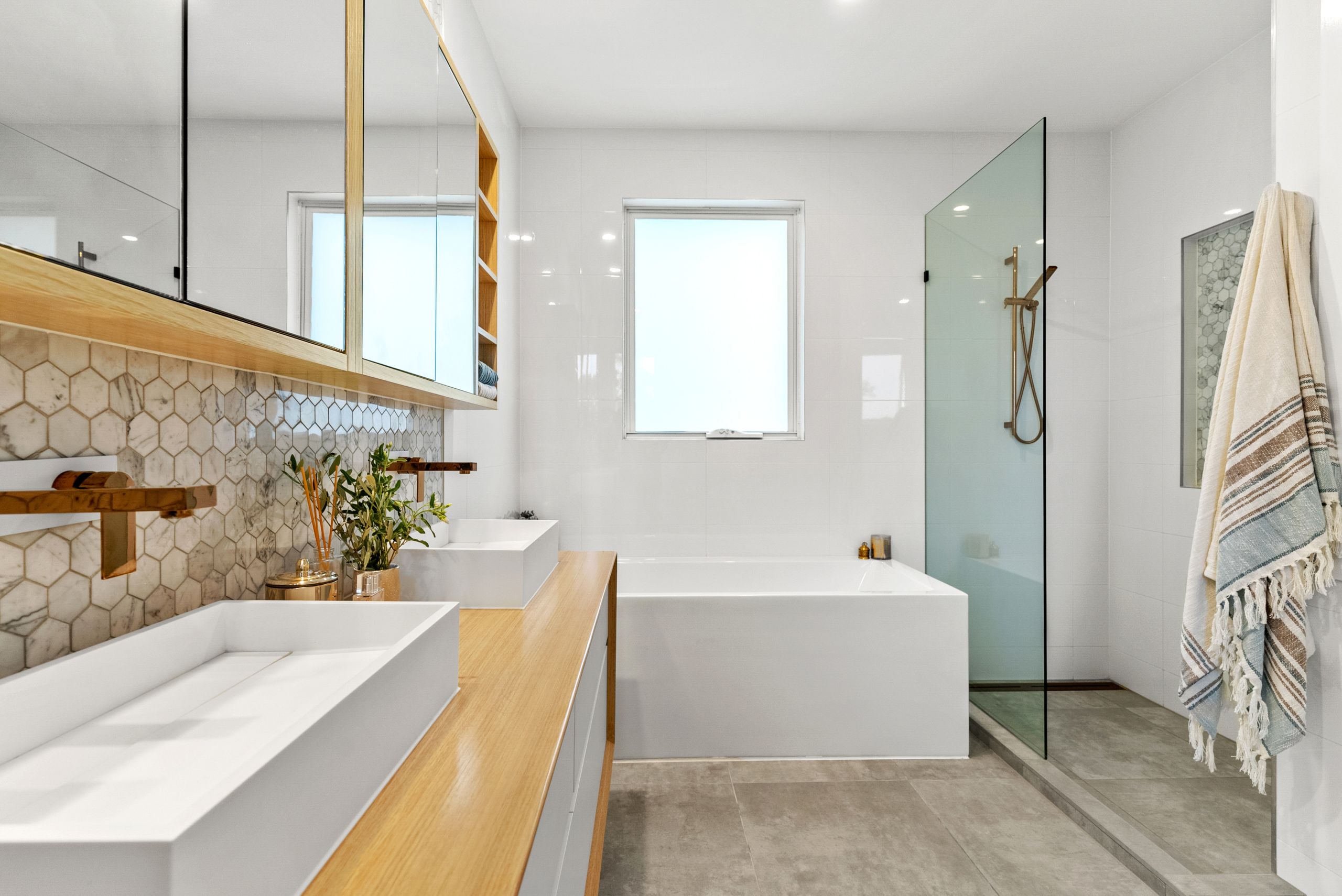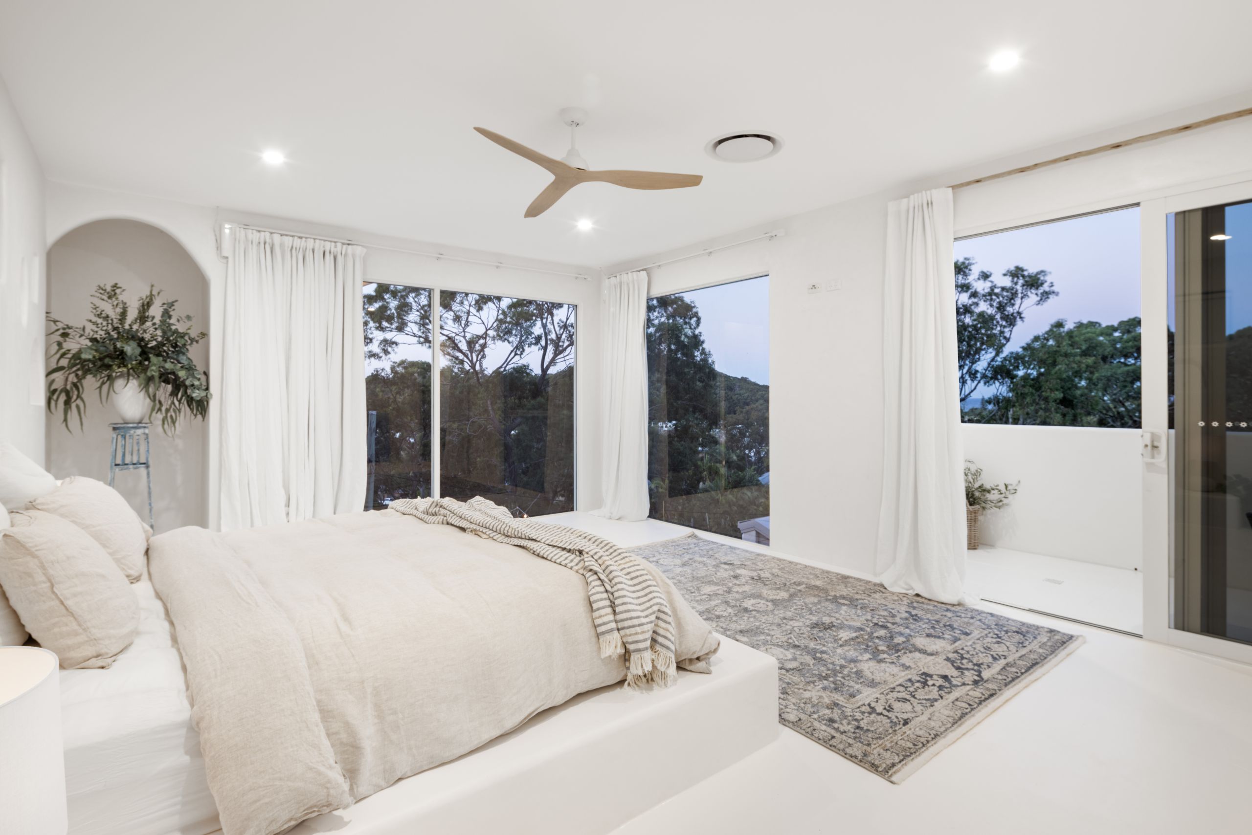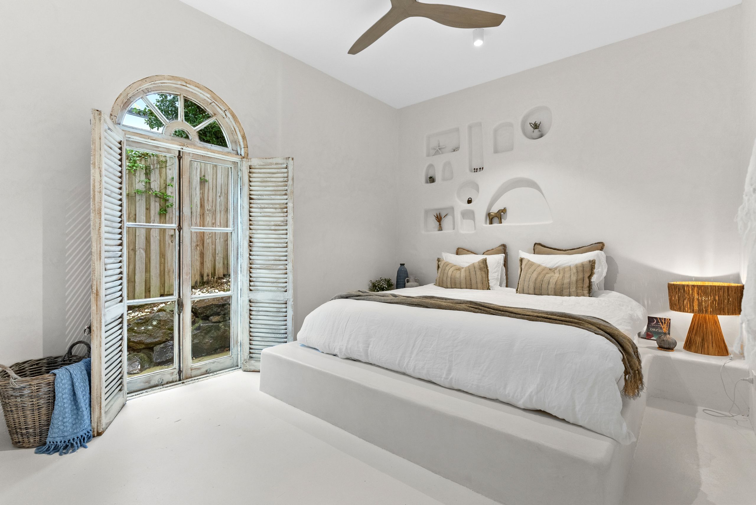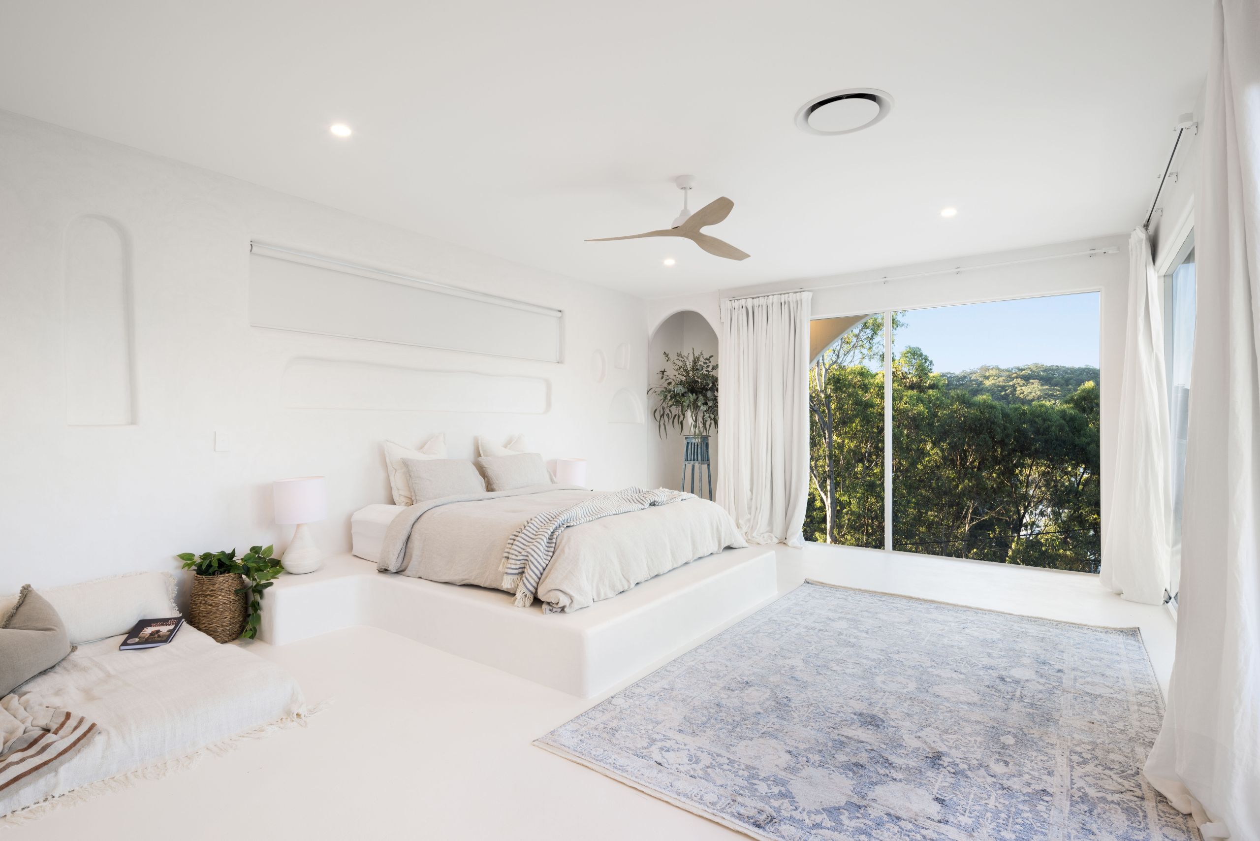 The Mykonos style swimming pool shimmers in white and blue, framing tranquil ocean vistas. The master suite enjoys breathtaking outlooks of emerald forest and turquoise sea, framed by floor to ceiling glass and a private balcony, complemented by a walk-in wardrobe, dressing room and a lavish ensuite. Across four bedrooms, three bathrooms and two living zones, the floor plan flows with ease – supported by an oversized garage, utility room and ample storage. You’ll find a beautifully appointed laundry complete with generous cupboards and a laundry chute. The home is constructed entirely in solid concrete and fitted with ducted air-conditioning throughout, Villa 81 blends sculptural beauty with enduring strength.
